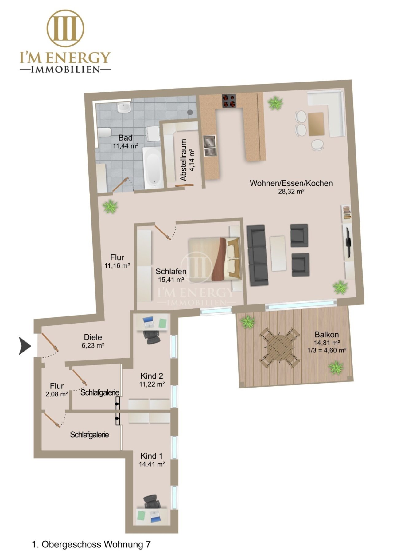 - Bad & Komfort: Ein großzügiges Wellness-Bad (ca. 11,44 m²) sowie ein separater Abstellraum (ca. 4,14 m²) sorgen für praktischen Luxus im Alltag.