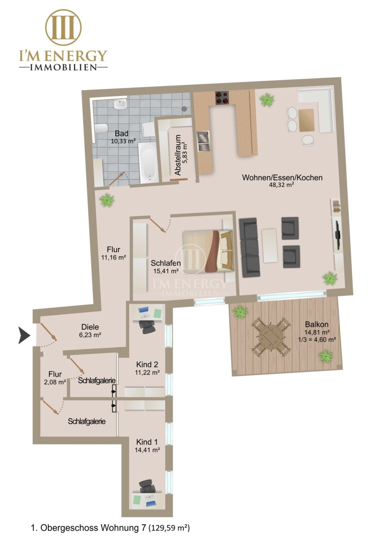- Drei flexible Schlafzimmer: Neben dem Hauptschlafzimmer (ca. 15,41 m²) bietet die Wohnung zwei weitere Räume (ca. 14,41 m² und 11,22 m²), die ideal als Kinderzimmer, Home-Office oder Gästezimmer genutzt werden können.